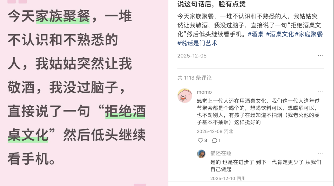 类似的变化也发生在家庭聚会中。有网友分享了自己冷言拒绝家庭劝酒的经历,在她的帖子下就有网友感慨:“上一代人还在执着于酒桌文化,我们这代人聚会时已经是想喝什么喝什么了。”