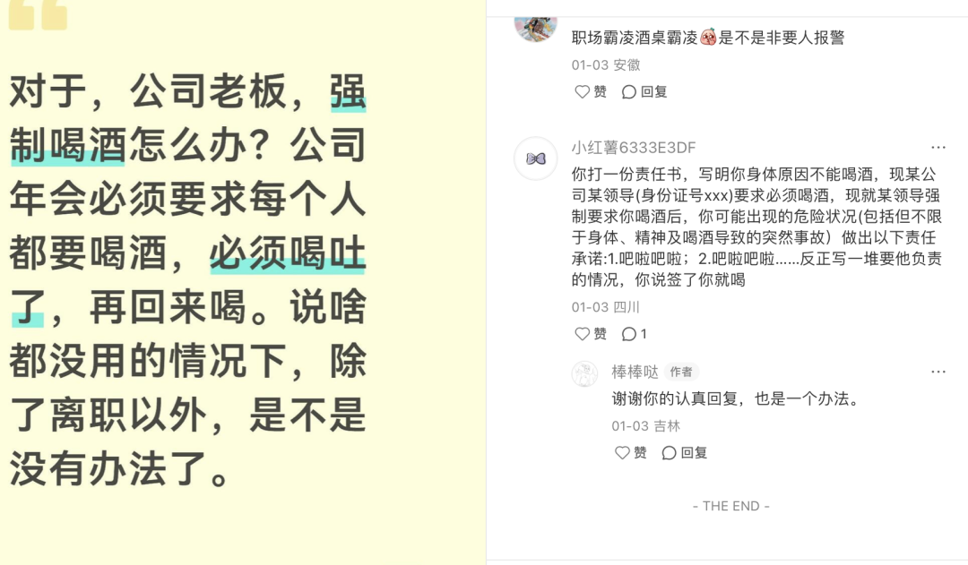 这一点在初入职场的年轻人身上尤为常见,她们也会在社交媒体上寻求破解的方法。大家都开始逐渐意识到,职场的酒桌文化仿佛已经异化成为一种合法的伤害,所以大家对职场酒局的抵触情绪也就更深。