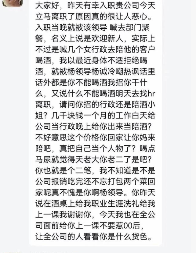 还有种令人不适的职场酒桌文化就是对女性的规训与骚扰。认为女性员工应该以“柔和”“活跃气氛”的角色参与酒局,甚至用“女性员工必须敬一圈”“美女要带头”等带有性别暗示的话语劝酒。