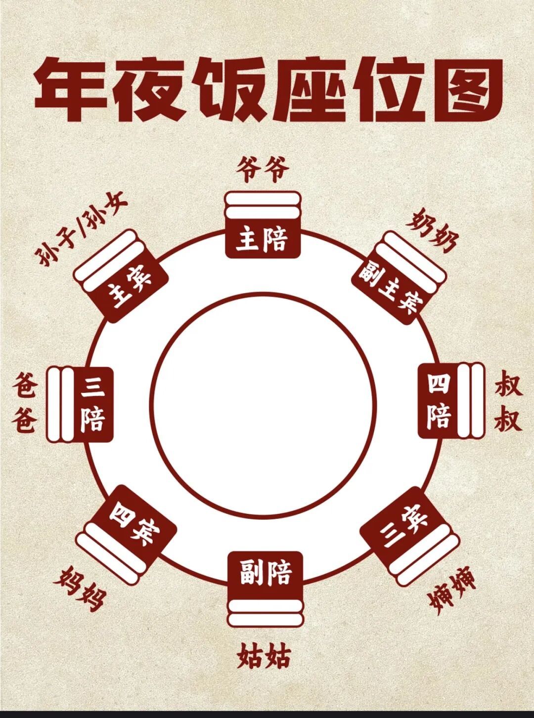 这种对座次的重视,在如今很多春节家宴中依然存在,且成为了日常家庭聚会的精神内核。在社交媒体上,你可以搜到由细心网友制作出的“家庭宴座位图”,通常会精细地标明祖辈、父辈、平辈与孩童的固定席位,方便大家参考。