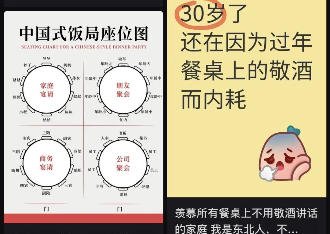“春节家宴座位怎么排?”“给长辈敬酒该说什么?”“i人过年生存技巧”……此类攻略帖频出,各种速成指南更是应运而生,这显然是当下年轻人应对传统酒局的考前突击复习。