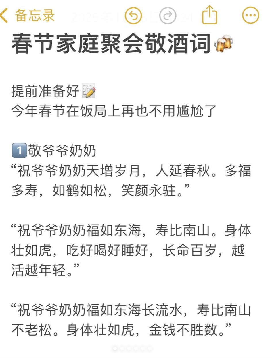 于是,网络上出现了大量的敬酒词教学,这些教学真正做到了细致分类:对祖父辈,侧重健康长寿、家族昌盛;对父母辈,感恩付出、祝愿事业顺遂;对平辈兄弟姐妹呢,关键在于对未来的美好展望……