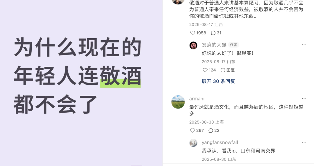 这种集体态度的转变,催生了一个值得玩味的现象。比如就有帖子追问,“当代年轻人为什么连敬酒都不会了?”这个问题本身或许就值得商榷,问题的核心可能不在于年轻人为什么“不会”,而在于他们“为什么必须会”。