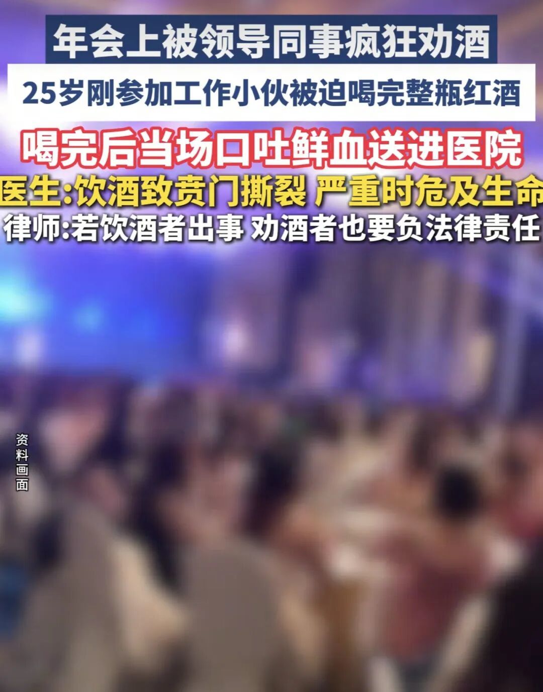 今年2月有媒体报道,一名刚入职的年轻人,从未饮过酒,却在公司年会上被同事与领导轮番劝酒,直到呕出鲜血,被同事紧急送医。经过检查才发现这位年轻人贲门(食管与胃的连接入口)撕裂。